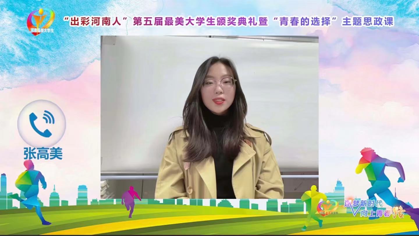 10月14日,“出彩河南人”第五届最美大学生颁奖典礼暨“青春的选择”主题思政课活动成功举办。我校2018级学子张高美获得第五届“出彩河南人”最美大学生荣誉称号。